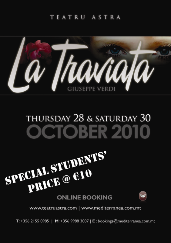 Students 25 years old or under may benefit from heavily special discounted tickets offered by the Teatru Astra of Gozo for the upcoming opera production La Traviata, held at the Teatru Astra on Thursday 28th and Saturday 30th October 2010. The Teatru Astra, in collaboration with the Ministry of Education, Employment and the Family and Bank of Valletta, is once again repeating this scheme to enable students to familiarise themselves with opera and enjoy the marvellous experience of this beautiful art form. In this way, a new generation of young opera lovers may be fostered. The scheme was initially launched with success in 2008. 200 tickets are thus being made available on a first-come first-served basis to students aged 25 years or under in Malta or Gozo for the first night of the opera production on Thursday 28th October. The tickets have been heavily reduced from the original price of €50 to €10 per student, with any other accompanying adult also benefiting from a 20% discount at the price of €40. Booking may be done on